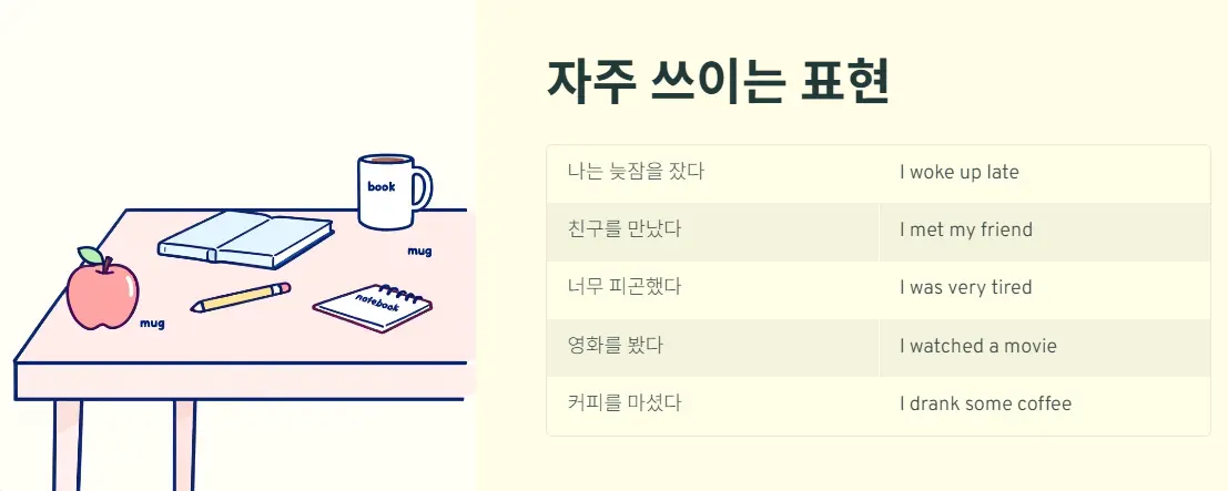 | 나는 늦잠을 잤다 | I woke up late |