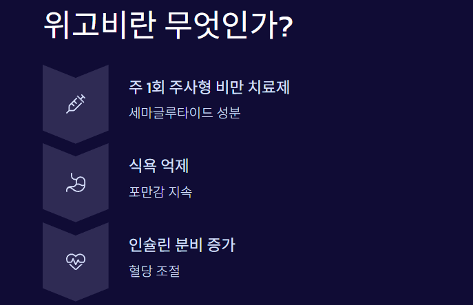 위고비(Wegovy)는 주 1회 맞는 주사형 비만 치료제입니다.